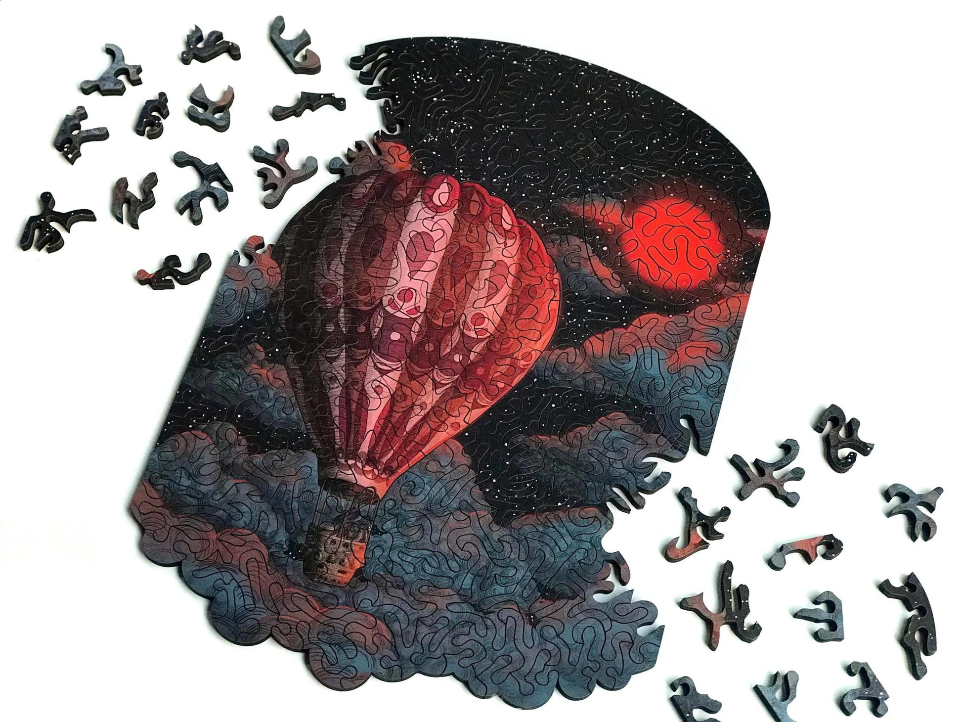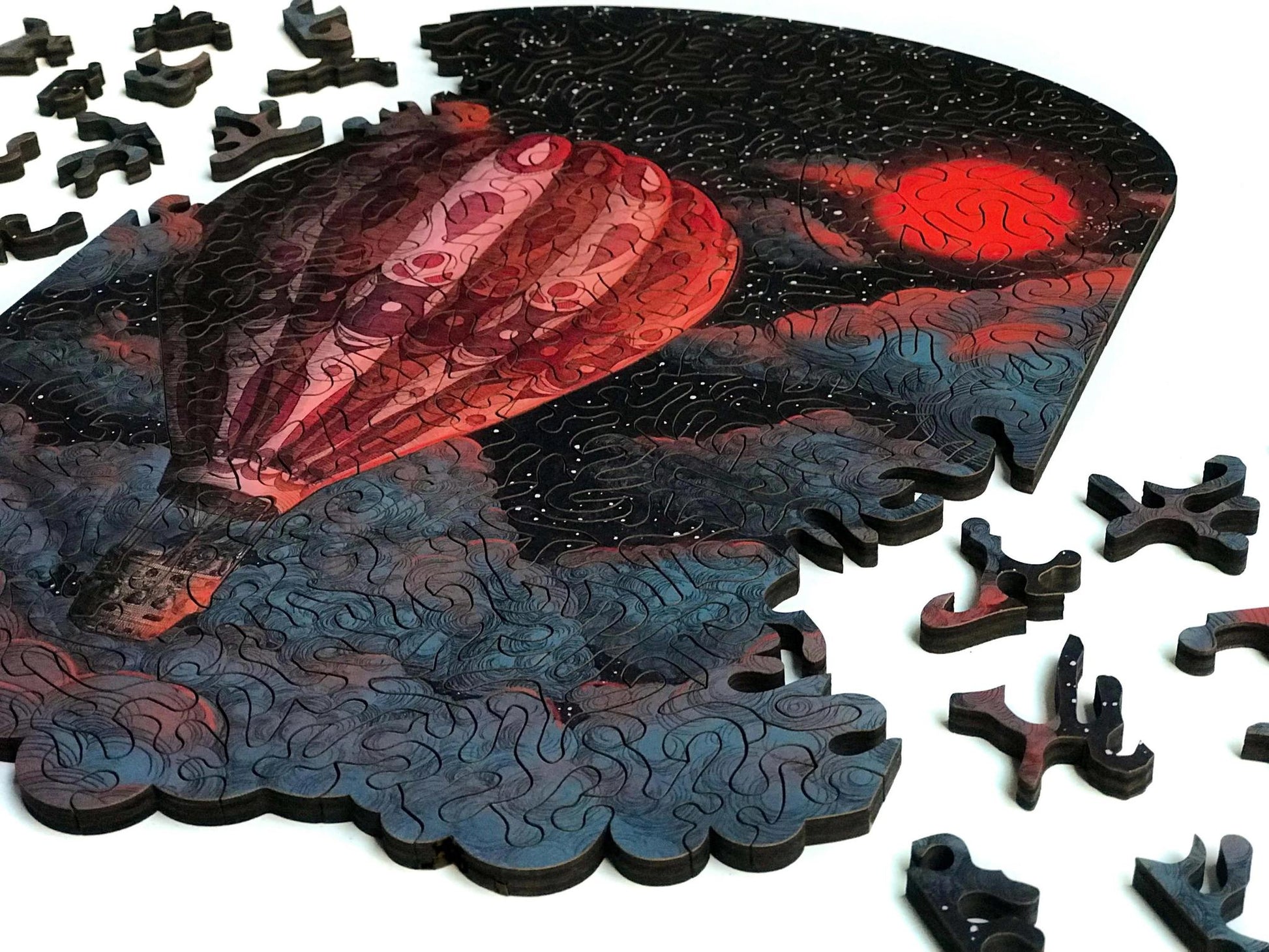 Adventure awaits! Leave the regular world behind and enter the realms of magic as you piece together this quality wood jigsaw puzzle featuring a dreamy scene painted by Toronto-based artist and illustrator Ella Mazur. You'll find not one but two hidden hot air balloons in this innovative cut pattern.