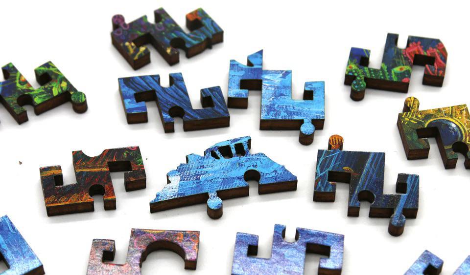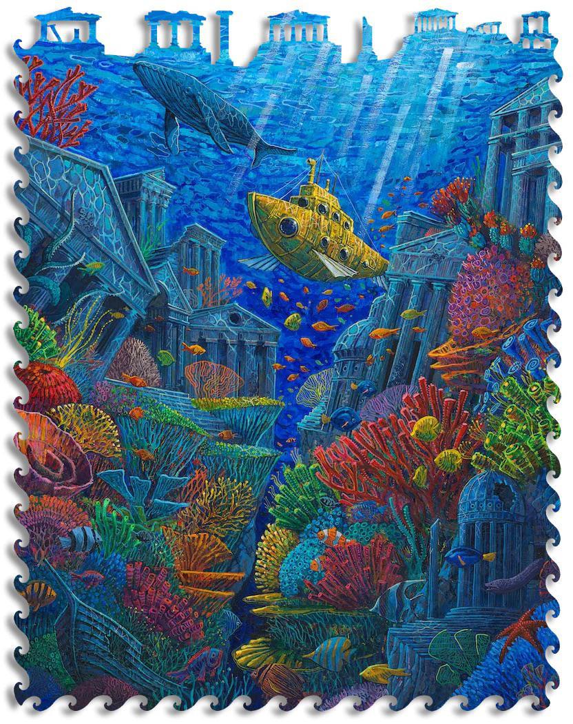 This is a 299 piece wooden jigsaw puzzle of the aquatic "Atlantyda" by Roch Urbaniak. The undersea ruins of the art are matched with a civilized puzzle design architected by Jef Bambas.