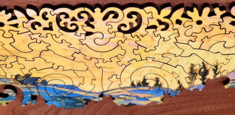 The puzzle has a decorative whimsical irregular edge with drop-outs (drop-outs are tiny bits of the image that are left out on purpose to enhance the look of the puzzle). The irregular edge is NOT shown on the box picture!