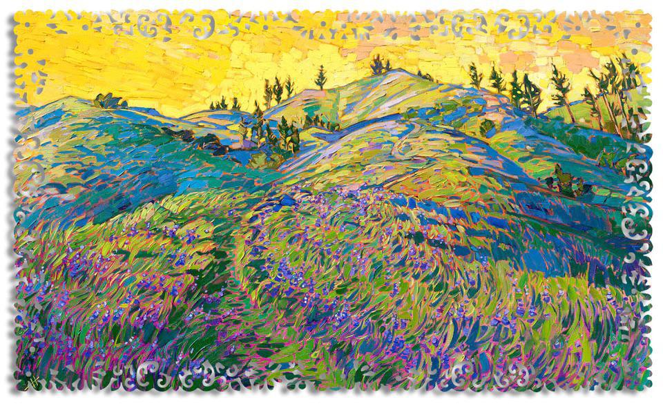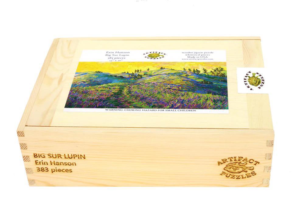 This 383 piece wooden jigsaw puzzle is a beautiful landscape by contemporary American painter Erin Hanson of purple lupin blooming at dawn on the coastal hills of Big Sur, California.