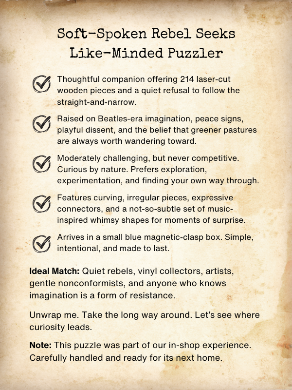 This puzzle arrives mysteriously wrapped, revealing its image only when you’re ready to begin your puzzling adventure. It was previously part of our in-shop experience and has been gently handled. Our team carefully reviews each puzzle to ensure all pieces are present and it’s ready for its next home.