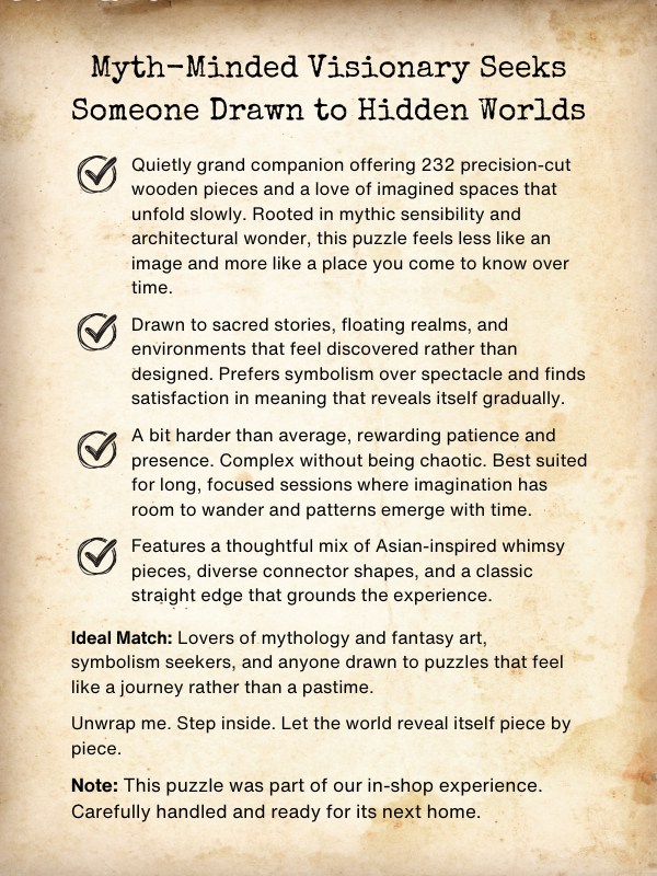 - Quietly grand companion offering 232 precision-cut wooden pieces and a love of imagined spaces that unfold slowly. Rooted in mythic sensibility and architectural wonder, this puzzle feels less like an image and more like a place you come to know over time.