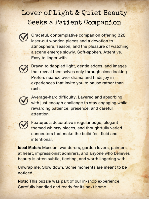 This puzzle arrives mysteriously wrapped, revealing its image only when you’re ready to begin your puzzling adventure. It was previously part of our in-shop experience and has been gently handled. Our team carefully reviews each puzzle to ensure all pieces are present and it’s ready for its next home.