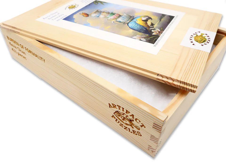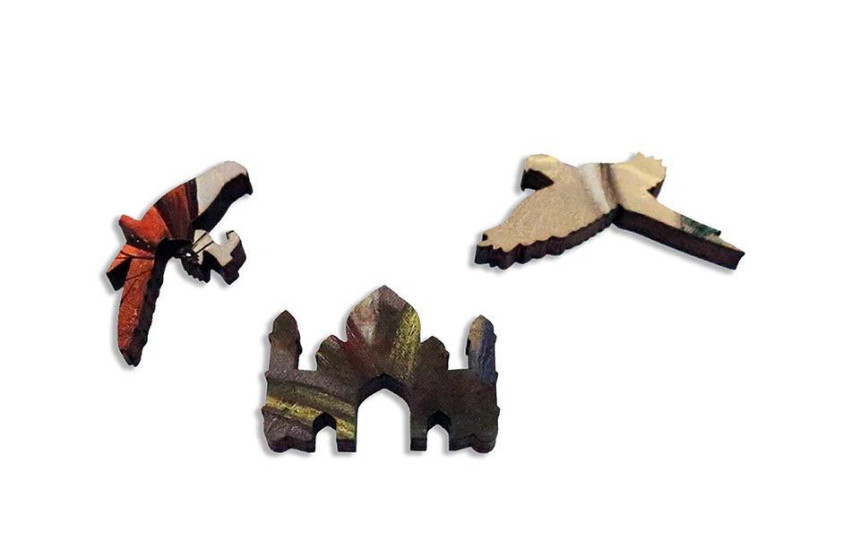 This is a 432 piece wooden jigsaw puzzle of Kevin Sloan's painting titled "Burden of Formality." The painting is a twist on a similar classic image by John James Audubon. The puzzle pieces were designed by Tara Flannery, and were inspired by the decorations of the Taj Mahal. The puzzle has a decorative irregular edge, and many whimsy pieces shaped like birds, teapots, and other British India inspired shapes. The puzzle connector shapes are varied and also inspired by the decorations of the Taj Mahal. The puzzle is harder than average. NOTE: The irregular edge is not shown in the image on the box! Like all our puzzles, the pieces are laser-cut from 1/4" thick wood. Packaged in our standard pine wood box. Made in USA.