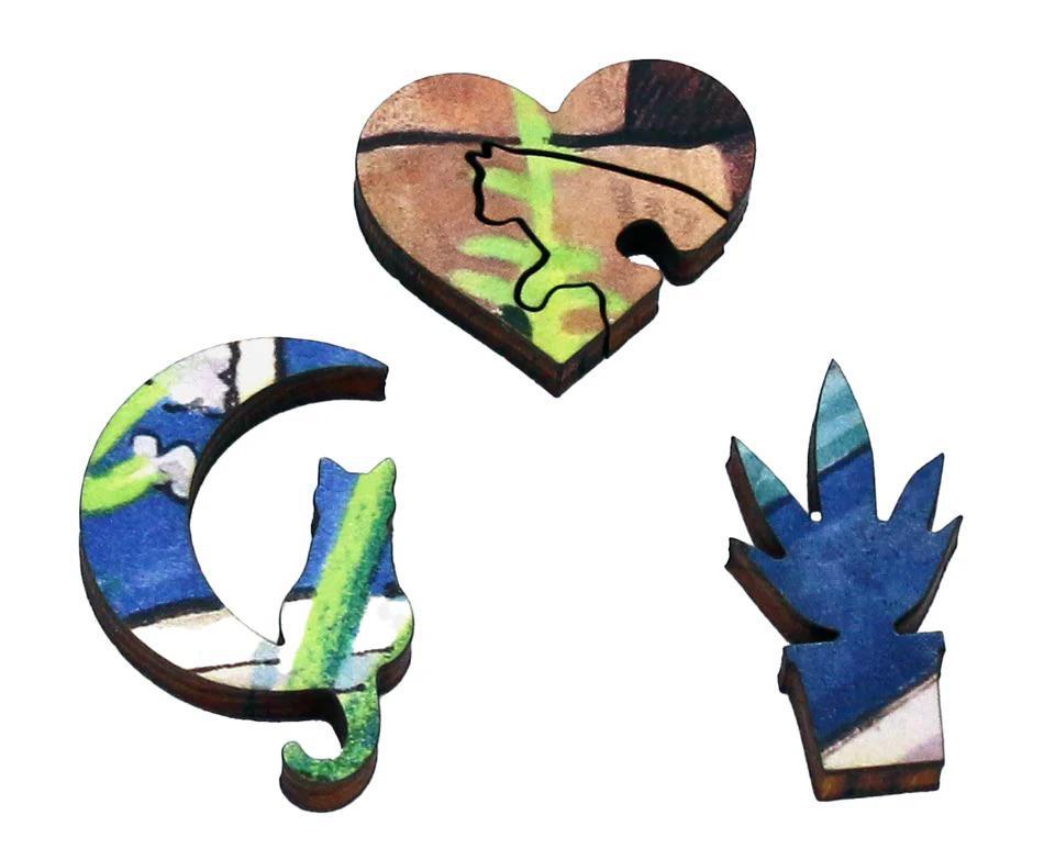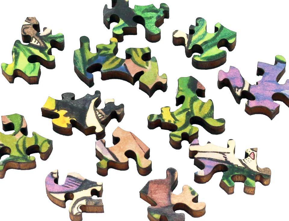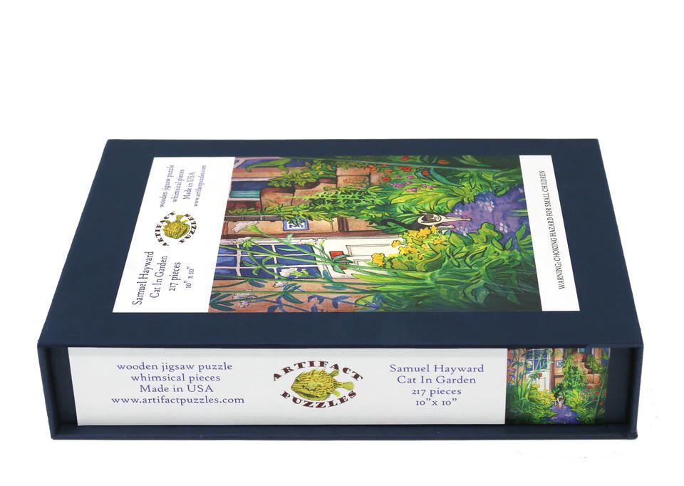 This whimsical wooden puzzle invites you into a sun-drenched garden where a curious cat lounges among blooms and buzzing life. Illustrated by British artist Samuel Hayward and brought to life in wood by Artifact Puzzles, this is a joyfully intricate celebration of color, pattern, and feline charm.
