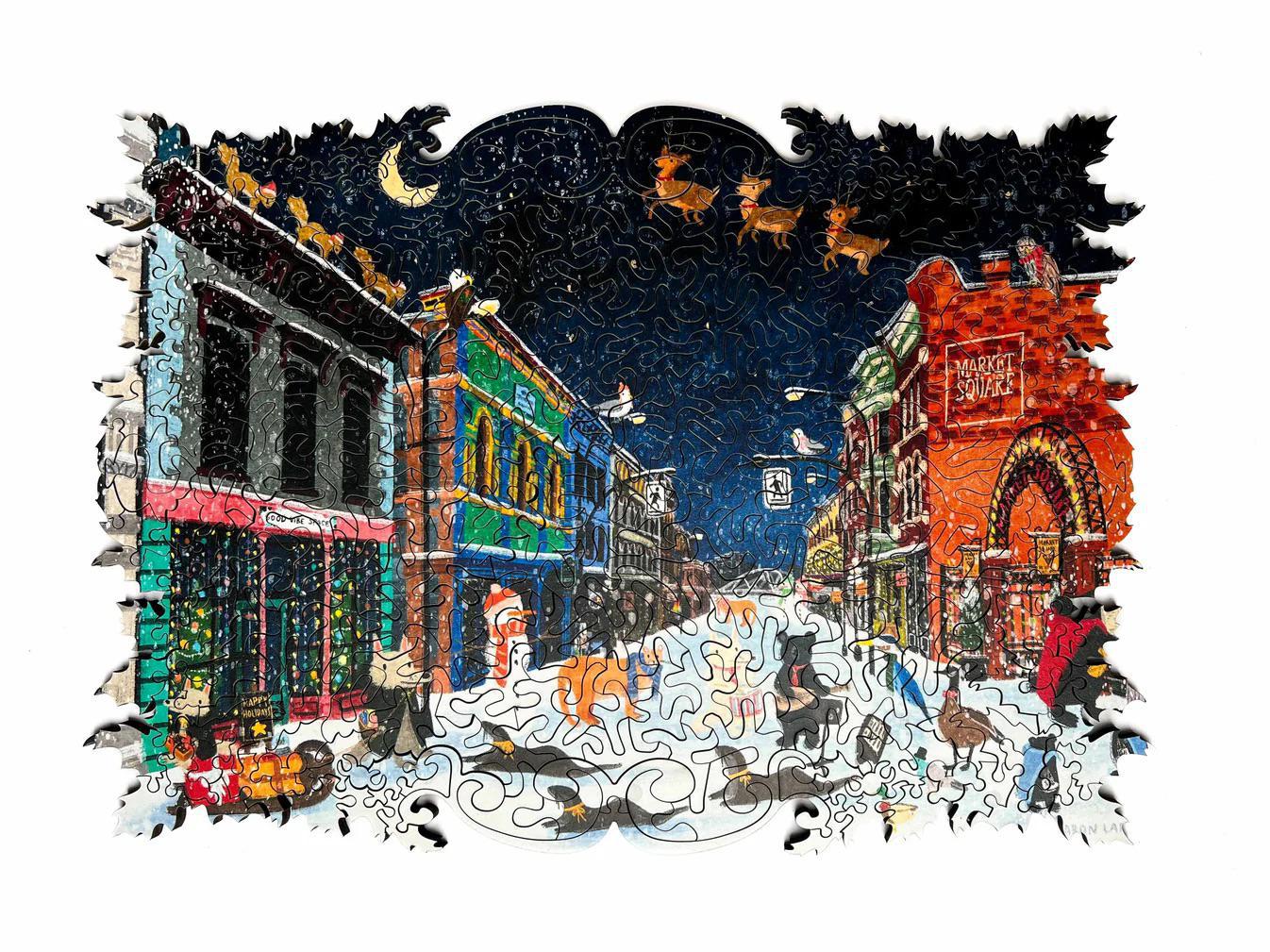 As you piece together the vibrant shops and snowy streets, you’ll find iconic animals like owls, geese, bears, wolves, and cougars, each bringing this heartwarming scene to life. The unique holly leaf-shaped border adds an extra festive challenge, making it the perfect holiday puzzle.
