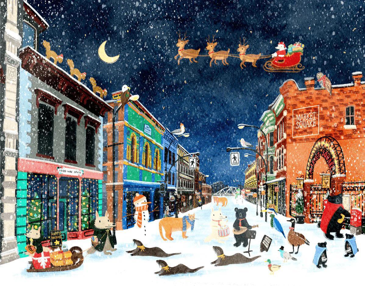 Step into a snowy holiday scene brimming with charm and festive wildlife! This beautifully illustrated puzzle by artist Sharon Lam captures a bustling streetscape adorned with Christmas cheer, filled with delightful critters to discover. From playful otters to majestic bald eagles, this puzzle celebrates the magic of winter wildlife and the joy of community.