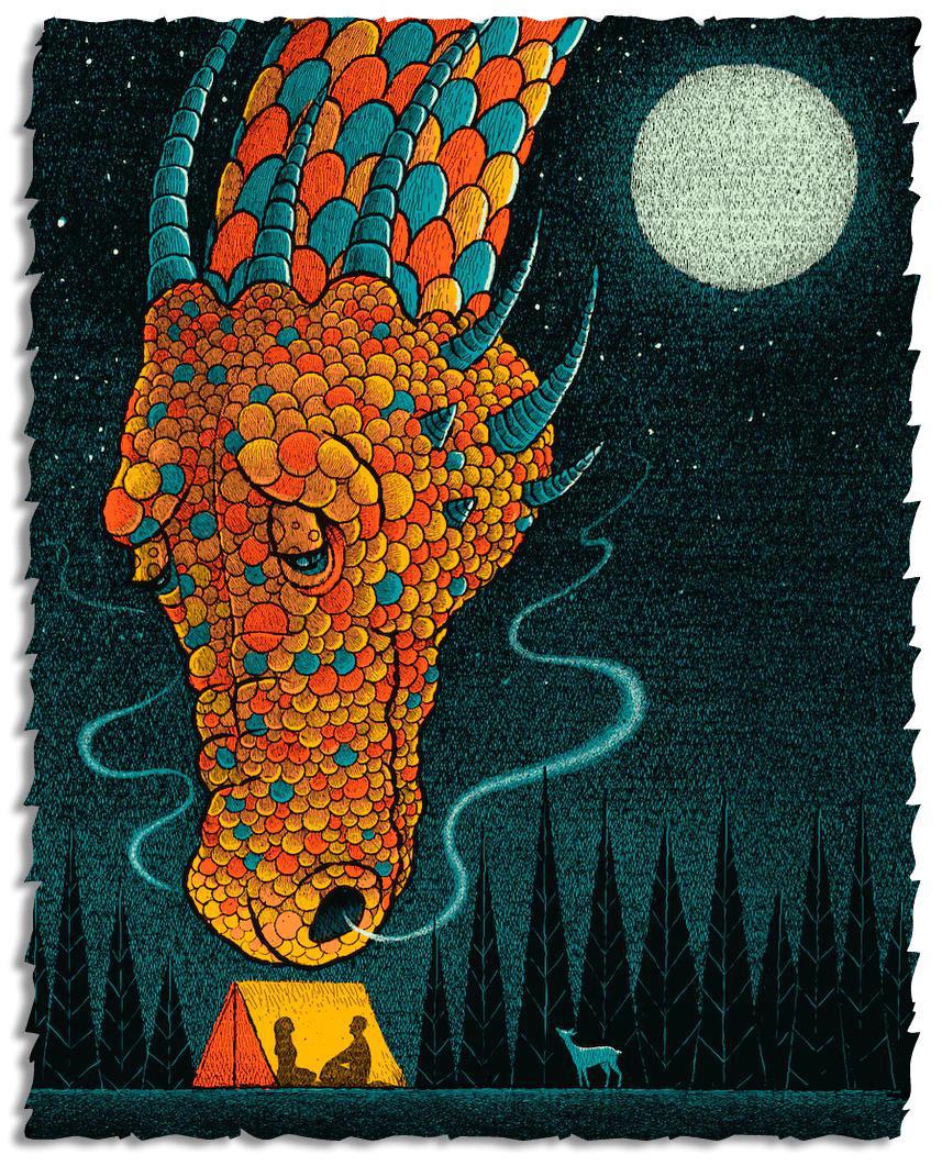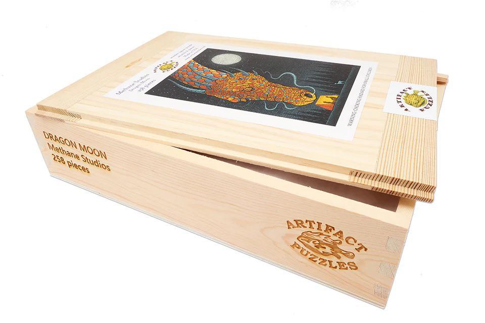 This is a 258 wooden jigsaw puzzle of "Dragon Moon" by Methane Studios. The stark beauty of the art is paired with a puzzle design by Danny Song that primarily consists of baying-wolf tessellated pieces, that contrast with the puzzle's detailed themed whimsies.