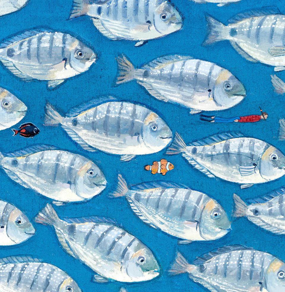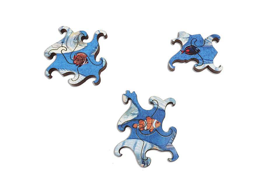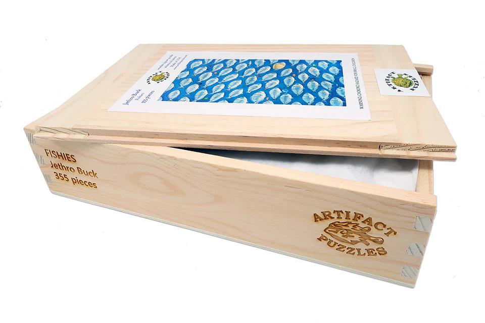 This is a challenging 355 piece wooden jigsaw puzzle of "Fishies" by Jethro Buck, who is a contemporary British painter trained in traditional Indian and Persian miniature painting techniques.
