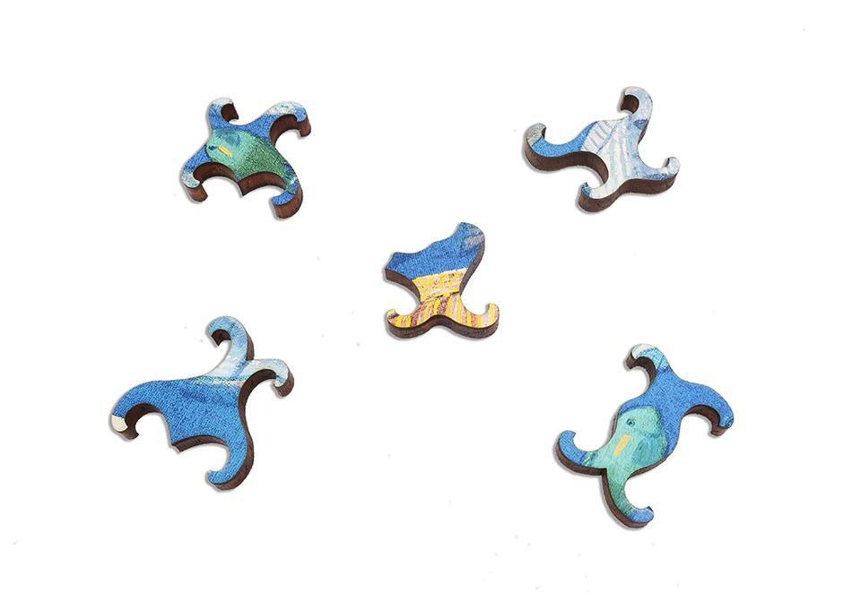 The puzzle design by Ashley Boyd consists of split tendril pieces with a wavy border and smattering of themed whimsies. This puzzle is very difficult thanks to the art and the split tendril connector pieces (see the product photos to see how those connect - they stay together well, but they are a bit harder to figure out than ordinary connector pieces). Like all our puzzles, made with 1/4" thick wood and the pieces are laser-cut. Packaged in our standard pine wood box. Made in the USA.