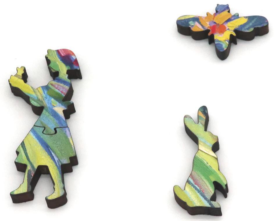 The puzzle design (by David Figueiras and Gema Palacio) has lots of meadow whimsies hidden amongst irregular pieces with diverse connectors. This puzzle has a lazy hand-drawn irregular edge. NOTE: The irregular edge is not shown in the image on the box!