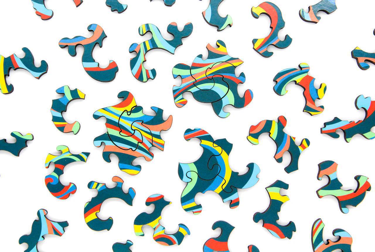 This puzzle is really hard! This puzzle features our custom nestled spiral piece design, plus the edge is irregular so it's hard to pick out the edge pieces, and there are no whimsies, which makes it even harder. Puzzle design by David Figueiras and Beckett Pintair.