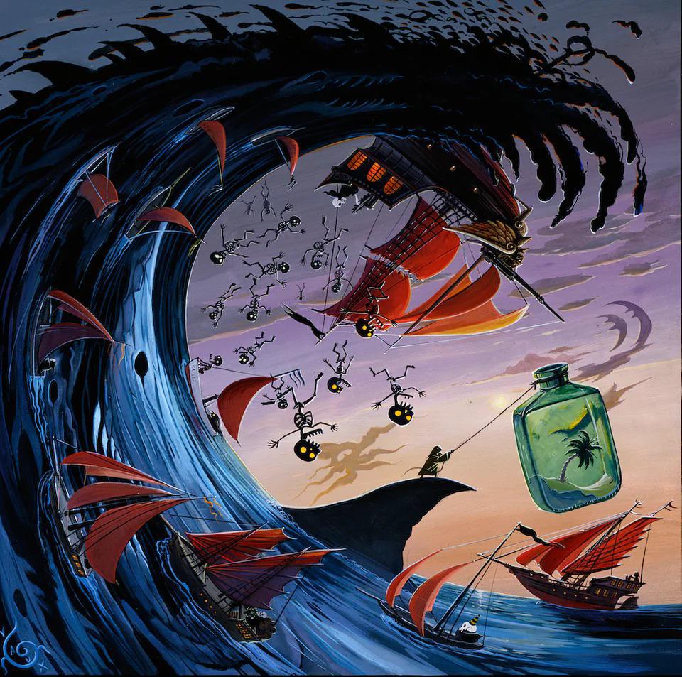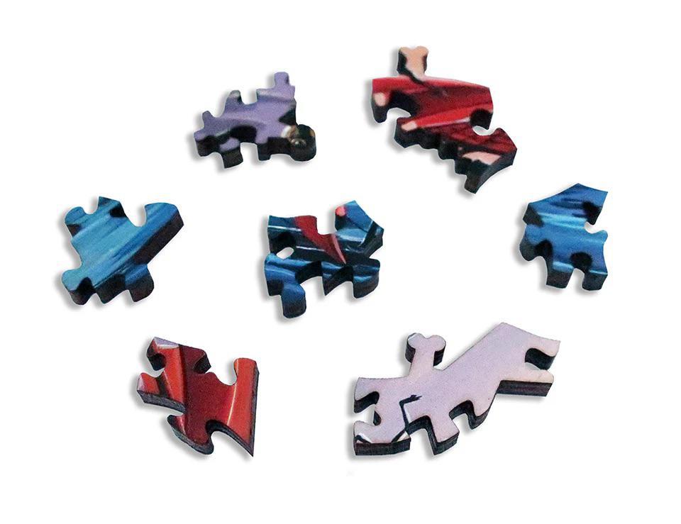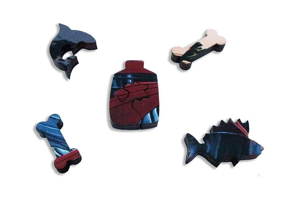 This is a 296 piece wooden jigsaw puzzle of Joe Vaux's painting, Message in a Bottle. Puzzle features themed whimsy pieces and some skeleton bone connectors; puzzle design by Tara Flannery. This puzzle has a straight edge, but it's more difficult than an average puzzle. All our puzzles are laser-cut from 1/4" wood, and made in USA. Packaged in our standard pine wood box.