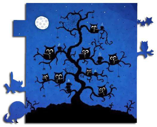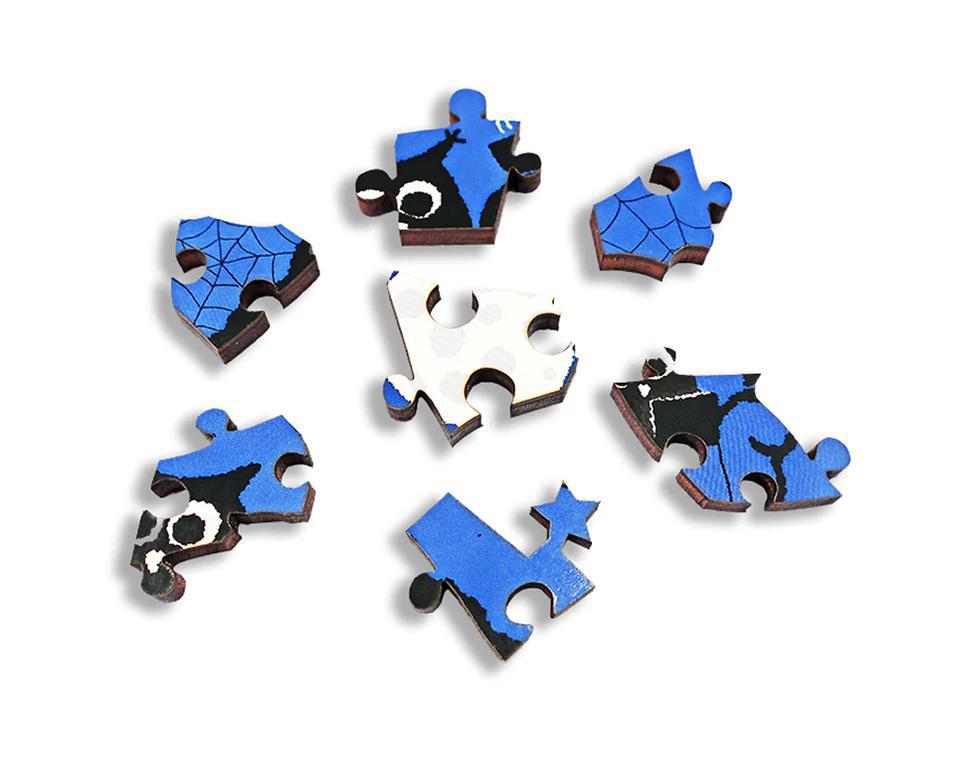 This is a 204 piece wooden jigsaw puzzle of VladStudio's "pixel-art" digital painting of an internet cafe for owls. This puzzle has many nocturnal-animal-shaped whimsy pieces (puzzle design by Maria Berg). The puzzle has a straight edge with a bit of a surprise, and coupled with the fact that it's all blue-black, this puzzles is a little more challenging than you might expect for 204 pieces. Like all our puzzles, the pieces are laser-cut from 1/4" thick wood. Packed in a small box with magnetic clasp. Made in USA.