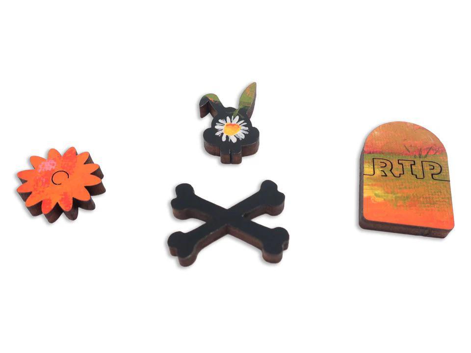 This is a macabre but playful 181 piece wooden jigsaw puzzle of "Stop and Smell the Daisies" by Vikram Madan.